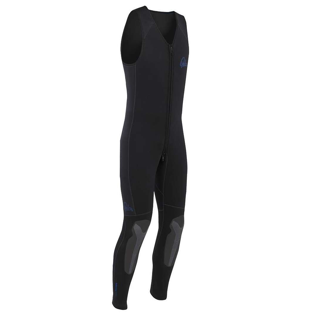 Caldo Longjohn in neoprene 5 mm con struttura incollata e cucita a punto invisibile, robusti rinforzi sulle ginocchia e cerniere alle caviglie.