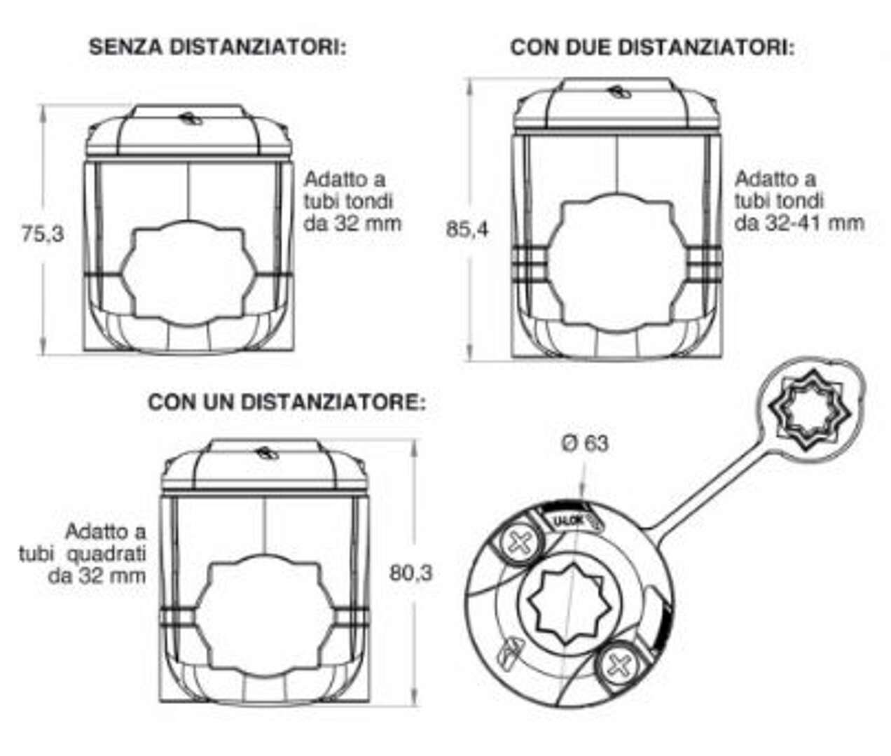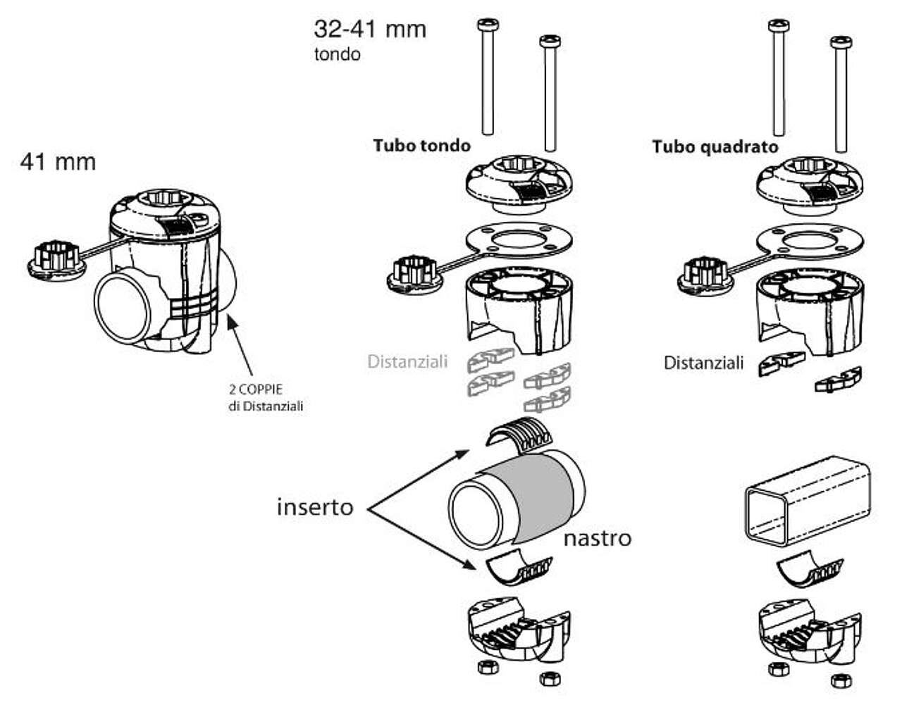 – Per corrimano di 41mm tondi: utilizzare DUE COPPIE di spaziatori, entrambi gli inserti in gomma (nastro di fissaggio opzionale)