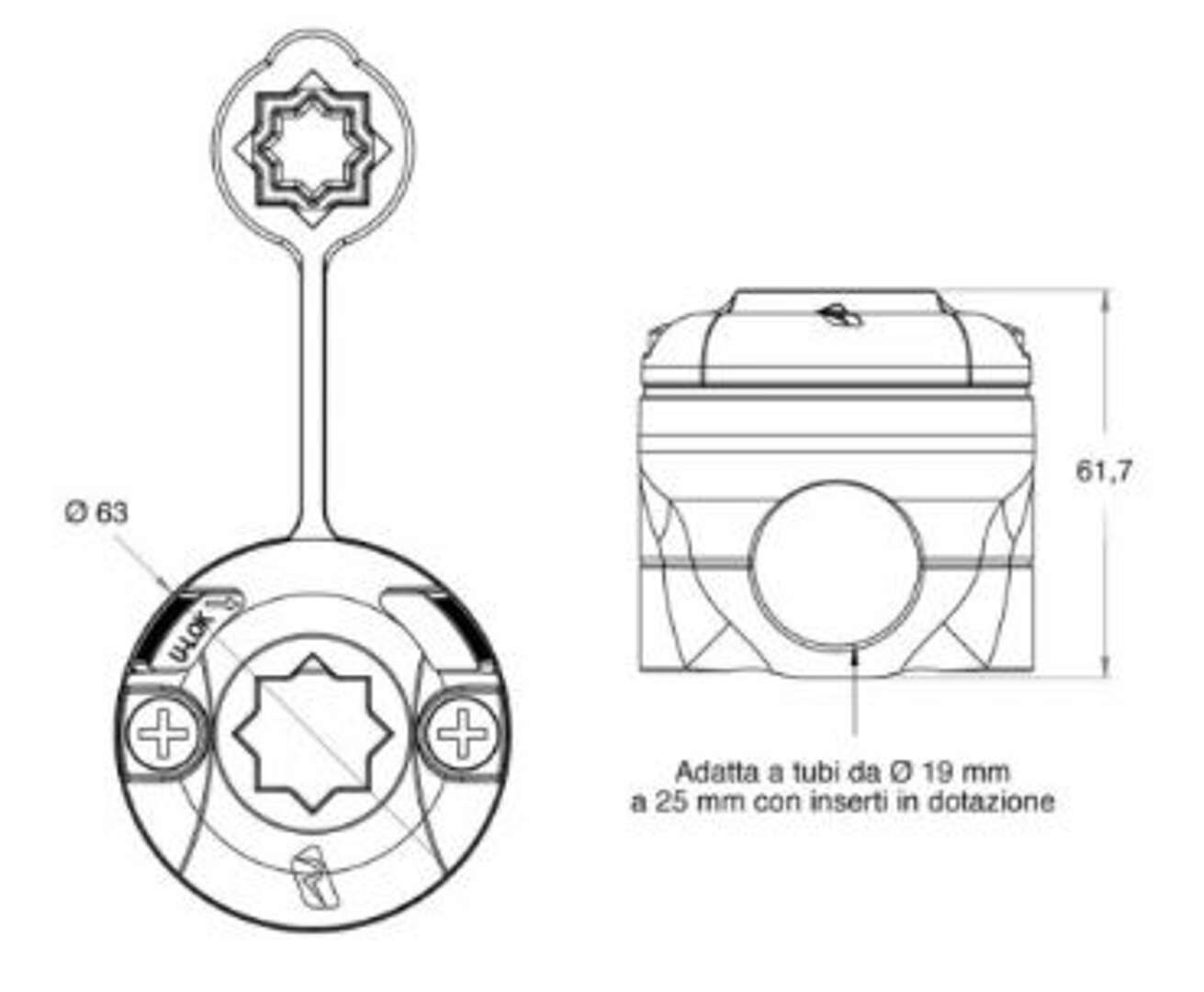 2) Poiché i corrimano possono avere diversi diametri, il RailMount 19-25 viene fornito con inserti in plastica e gomma. L’inserto in plastica va utilizzato solo per i corrimano di 19 mm di diametro.